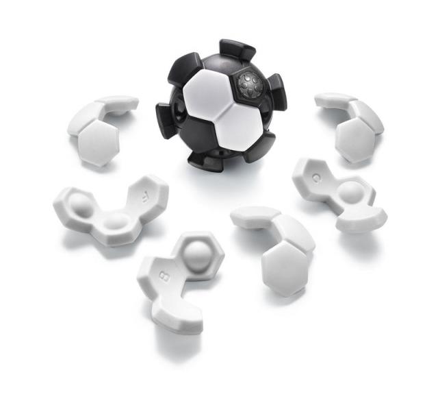 Can you tackle this 3D challenge Ready to take a shot at the Plug & Play Ball Try to fit all 7 puzzle pieces on the ball. But watch out! Moving the small starting piece during the game will get you a red card. A mini 3D puzzle game that doubles as a fidget game and that needs no setup. Just plug and play! Can you tackle this challengeHOW TO PLAYStep 1 Remove all the puzzle pieces from the ball before you start and place the smaller piece on the ball. This starting piece should always cover 1 place on the ball with a dimple and 1 place without a dimple.Step 2 Fit the 6 other pieces on the ball, without removing the small starting piece.Step 3 You have found a solution when all pieces fit on the ball. Often several solutions are possible.Inside the Box: Ball-shaped frame, 7 puzzle piecesAge: 6 to adult Single Player